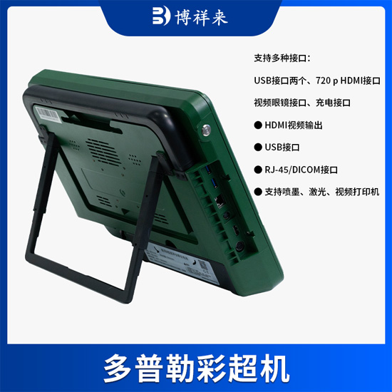 3.9 扩充接口:USB接口两个、720 p HDMI接口、视频眼镜接口、充电接口、● HDMI、视频输出;● USB接口;● RJ-45/DICOM接口;● 支持喷墨、激光、视频打印机
